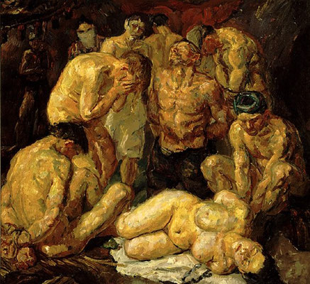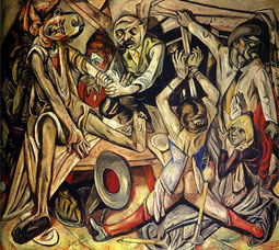 "Szene aus dem Untergang von Messina" (Scène de la chute de Messine - 1909, St.Louis Art Museum) - Beckman aborde ce sujet à la lecture du terrible tremblement de terre survenu dans le sud de l'Italie le 31 décembre 1908, 80.000 morts sur une population de 120.000 : il entend, face à ce drame, tenter de capter "toute la vie de chair palpitante", on évoque dans le mouvement Delacroix dans les tons de terre, et tandis que l'homme à demi dévêtu, accroupi au sol au premier plan, qui incarne toute la résignation douloureuse devant un tel cataclysme, la femme nue, derrière lui, semble défier le cours de sa destinée. Plus en arrière, deux hommes s'affrontent, dans la misère absolue l'homme apparaît dans sa nature même, victime et bourreau....