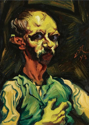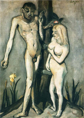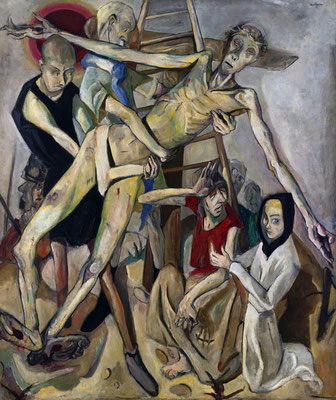 Der Erste Weltkrieg - L'expérience de la guerre va modifier son regard et sa technique : engagé volontaire dans le corps sanitaire, il entend vivre réellement le combat de survie qu'il avait idéalisé ("mon art s'y ravitaille", écrit-il en 1915, soulignant l'aveuglement dans lequel se trouvaient bien des protagonistes de cette tragédie). Ses lettres vont témoigner du progressif sentiment d'horreur qui l'envahit. En juillet 1915, il s'effondre. Son fameux "Selbstbildnis mit rotem Schal" (autoportrait avec foulard rouge) de 1917 (Staatsgalerie Stuttgart) tente une autoanalyse après être sorti de l'enfer de cette guerre : désormais c'est bien sur l'individu qu'il va porter son expression, l'individu incapable de se tirer d'affaire dans un monde empli de violence. Sa technique picturale évolue de même, les couleurs sont réduites, la pâte est plus épaisse, les visages et les corps deviennent morbides : 1917, "Kreuzabnahme", Museum of Modern Art, New York; "Adam und Eva", Berlin, Nationalgalerie; "Christus und die Sünderin", Saint Louis, The Saint Louis Art Museum; à rapprocher de Rogier van der Weyden, "Beweinung Christi" (um 1440-1450), Brüssel, Musées Royaux des Beaux-Arts ....