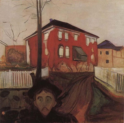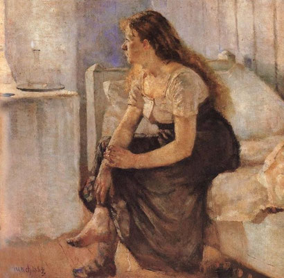 "Sans la peur et sans la maladie, écrira Munch, ma vie serait comme un bateau sans rames". A l'âge de cinq ans, il avait perdu sa mère, et, en 1889, alors qu'il séjourne à Paris, son père meurt à son tour (marqué par le tableau "Nuit"), et jusque dans les années 1890, Munch vécut dans l'angoisse de perdre toute sa famille. L'une de ses premières oeuvres, "L'Enfant malade" (Det syke barn, 1885-86), tant décriée par son aspect peu "fini", et "Le Printemps" (Våren, 1889), renvoient à la maladie de sa soeur Sophie, qui n'a que quinze ans et atteinte de phtisie meurt en 1886, mais aussi à sa propre convalescence : ici comme par miracle, alors que le visage extrêmement pâle contraste avec celui de la mère, qu'un carafon de verre et des fioles constituent tout autant d'éléments rendant palpable le silence, un léger mouvement de l'air gonfle les rideaux et semble présager des jours meilleurs, Munch recouvrera effectivement ses propres forces. Les premières esquisses de son œuvre la plus connue, "Le Cri", s'inscrivent dans cette démarche...
