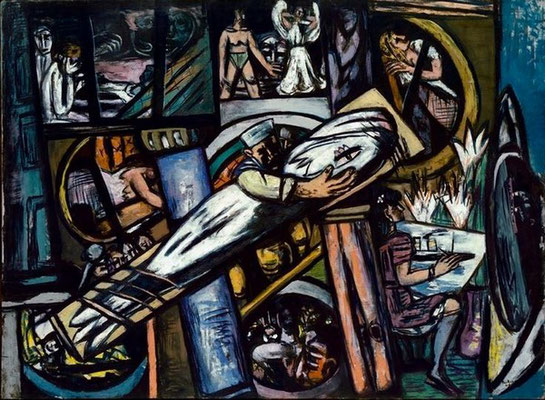 Nationalsozialismus und Emigration - Prise de pouvoir par les Nazis. Le "Départ" est le premier triptyque (1932) de cette période. Les autoportraits accompagnent la dureté des temps: "Der Befreite", Le Libéré, 1937, "Selbstbildnis mit Horn", Autoportrait au cor, 1938. Beckman est exilé à Amsterdam toute la Guerre, il lui faudra attendre 1947 pour gagner les Etats-Unis (Saint-Louis du Mississipi, puis New York). En 1938, Beckman écrit : "Ce qui est le plus important pour moi dans mon travail, c'est l'idéalité derrière la réalité apparente. Du présent donné, je cherche un pont vers l'invisible" (Worauf es mir in meiner Arbeit vor allem ankommt, ist die Idealität, die sich hinter der scheinbaren Realität befindet. Ich suche aus der gegebenen Gegenwart die Brücke zum Unsichtbaren) - Beckmann a trouvé son style personnel, il a rompu avec la peinture narrative et se sépare de l'expressionnisme : il abandonne de plus en plus les formes déterminées linéairement au profit de grandes surfaces colorées cernées d'épais contours noirs, et ses compositions, ses fameux triptyques, exposent des personnages comme autant de fragments sans rapports explicites entre eux, utilisant un univers iconographique puisé dans la littérature, la mythologie, la philosophie. Dans "The Town" (La Ville, 1950), Beckmann voit New York en femme nue, offerte, ligotée, sacrifiée.