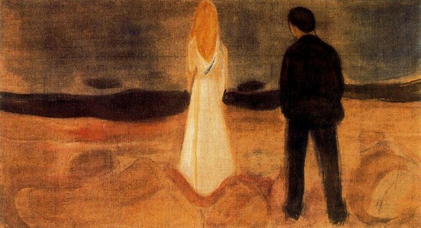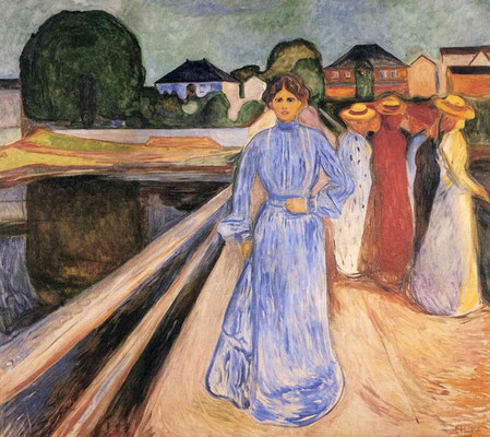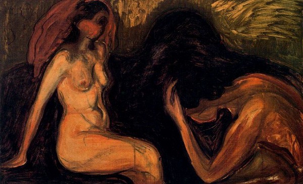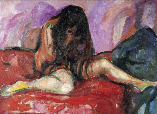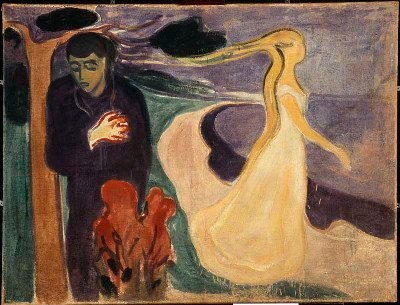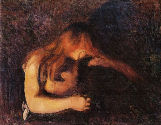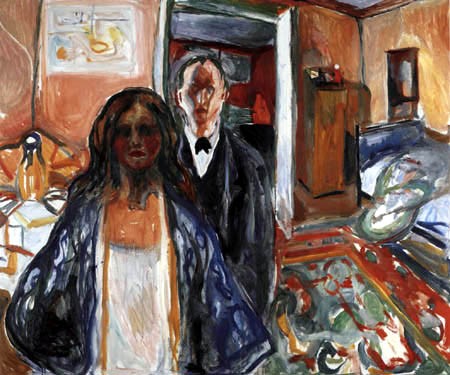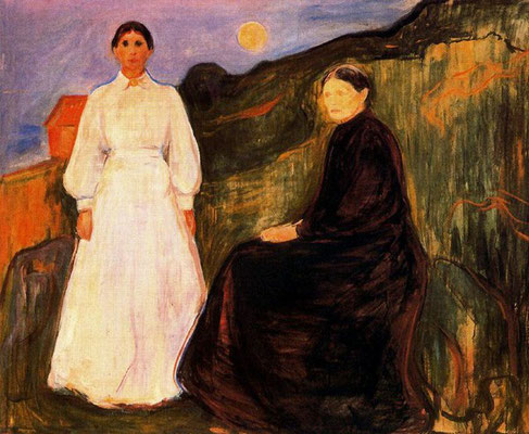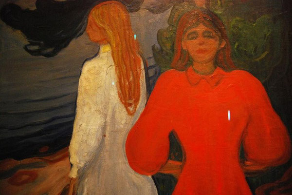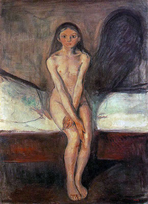 Dans une société norvégienne au bord de l'implosion psychique, - on retrouve ici les drames d'Ibsen -, Munch associe sexualité et angoisse, thème principal de sa fameuse "Fresque de la vie", poème de la vie, de l'amour et de la mort. "La Puberté" ("Pubertet", 1894, National Gallery, Oslo, Norway) montre une jeune fille qui non seulement croise les bras dans un geste de pudeur, mais vit l'éveil de sa sexualité avec le sentiment d'être livrée sans défense à un avenir inconnu. Dans "Maison au clair de lune" (1895), une jeune femme reste figée devant sa maison de bois sans oser franchir le seuil de son foyer. Sans "la Tempête" (Storm, 1893, Museum of Modern Art (MoMA), New York), nous sommes à Aasgaardstrand et alors que les éléments se déchaînent, une femme en robe blanche s'est détachée d'une groupe d'autres femmes et dans une tension palpable tient ses mains plaquées contre ses oreilles pour fuir une énergie latente et quasi pulsionnelle. "Homme et femme" de 1898 ("Mann og kvinne", Rasmus Meyer Collection, Bergen, Norway) montre toute l'ambiguïté de l'attirance des sexes, une fatalité, une menace, sans doute celle de sa propre sexualité , le corps de la femme ne va pas cesser d'engendrer pour le peintre des ombres lourdes et sombres, que l'on retrouve dans "Le Baiser" de 1857 ("Kyss", Munch Museum, Oslo, Norway) : "Vampyr" (Love and Pain, 1895, Munch Museum, Oslo, Norway), "Self-Portrait In Hell" (" Selvportrett I Helvvette", 1903, Munch Museum, Oslo, Norway), "The Murderess", 1906 (Munch Museum, Oslo, Norway), "Jealousy, From The Series The Green Room", 1907 (Munch Museum, Oslo, Norway), "Nude", 1913 (Munch Museum, Oslo, Norway), "Man And Woman" (Mann og kvinne), 1912-1915 (Munch Museum, Oslo, Norway), "The Artist And His Model", 1919-1921 (Munch Museum, Oslo, Norway)....