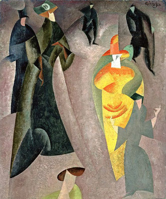 C'est en 1911, à Paris que Lyonel Feininger découvre la peinture cubiste et la voie esthétique qu'il entend emprunter, abandonnant le figuratif dans le traitement de son thème dominant, la ville, pour des compositions d'unités cubiques, fragmentées. Il expose ses oeuvres en 1913 avec les membres de Der Blaue Reier, et enseigne au Bauhaus à Weimar. Parallèlement, il réalise à partir de 1905 des caricatures pour des revues humoristiques et travaille pour le Chicago Tribune. Kirchner, dans Postdamer Platz" (1914), intégrera ce type de composition. Lorsque le Bauhaus fut supprimé par les Nazi, Feininger regagna son New York natal ...