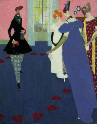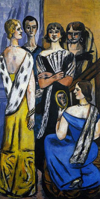 "Grosses frauenbild (Fünf frauen)", 1935 - Une nature morte peinte par Beckmann en 1924 pendant les premières années de Francfort nous laisse entrevoir le visage d'une femme portant un masque de carnaval, il s'agit de Nailale Dr Hildegard Melms avec qui Beckmann a eu une liaison en 1923 et qu'il peindra plus tard dans son portrait de 1935 des cinq plus belles femmes de sa vie, Five Women (Large Women Painting). C'est qu'en 1924, le mariage de Beckmann avec sa première femme, Minna Tube, était en train de se désintégrer : mariage qui remonte à 1902, elle abandonna pour lui la peinture, il dira ne pas l'avoir totalement "possédée", elle fit par la suite une carrière de chanteuse d'opéra et resta proche de lui. Peu de temps après, toujours en 1924, il rencontre à Vienne la jeune violoniste Mathilde "Quappi" von Kaulbach, fille du peintre munichois Friedrich August von Kaulbach, qui deviendra l'amour de sa vie de Beckmann (Portrait Minna Beckmann-Tube, 1924, Still Life with Gramophone and Irises, 1924, Sleeper, 1924). Dans "Fünf frauen" (1935), Beckmann nous a représenté Lilly von Schnitzler, sur le côté gauche, les cheveux blonds, la robe jaune, aristocrate et épouse du président d'I.G. Farben, futur collaborateur nazi, elle, femme de société par excellence qui collectionna ses tableaux, Katharine Rapoport von Porada, debout à droite, "la plus belle femme de Berlin", qui organisera en 1926 à Paris des expositions en faveur de Beckmann, Quappi se tient au centre, sensuelle et élégante, à sa droite Naila, près de la porte, apparemment courroucée, et enfin Beckmann lui-même, jeune, dans le miroir, que Minna Beckmann-Tube nous montre...