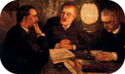 "Sickness, insanity and death were the angels that surrounded my cradle and they have followed me throughout my life" - Instable, tourmenté, Munch ne peint pas ce qu'il voit mais ce qu'il ressent, et la modernité de son oeuvre vient de cette retranscription qu'il fait de ses difficultés à exprimer verbalement ses traumatismes de jeunesse, ses personnages sont figés dans des poses d'une grande gestuelles expressive, le visage de ses personnages féminins ont des allures de masque et ses personnages masculins des profils méconnaissables : tout le tableau est dans sa mise en scène et pourtant nous ne parvenons pas à réellement interpréter psychologiquement ce qu'il donne à voir et pourtant à interpréter... Munch peut être considéré comme le pionnier de l'expressionnisme dans la peinture moderne. Il est très tôt réputé pour son appartenance à une nouvelle époque artistique en Allemagne et en Europe centrale, et son œuvre et son importance sont aujourd'hui reconnues en Europe et dans le monde. Les œuvres de Munch les plus connues sont celles des années 1890, notamment "Le Cri". Edvard Munch grandit dans la capitale norvégienne, qui s'appelait Kristiania à l'époque (Oslo), une capitale marquée par une bourgeoisie aux principes moraux et religieux des plus conservateurs que dénonçait une bohème artistique individualiste dominée par le peintre Christian Krohg (1852-1925), Hans Jæger (1854-1910), écrivain et leader charismatique, et la belle Oda Lasson (1860-1935), maîtresse des deux précédents. La peinture parisienne, le naturalisme comme l'impressionnisme, pénètrent alors les cercles artistiques qu'animent Frits Thaulow (1847-1906), professeur de Munch et tenant du naturalisme, Gerhard Munthe (1849-1929), plus porté à l'art nouveau, Erik Werenskiold (1855-1938), gagné à l'impressionnisme. Le tableau de Munch, "Jurisprudence" (1887, Oslo, Nasjonalgalleriet), qui montre trois jeunes hommes plongés dans ce qui semble un problème juridique important, ne pouvait que recevoir un accueil critique dans une atmosphère bourgeoise alors si convenue.