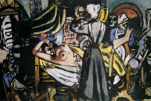 En 1906, Beckmann a 22 ans, "Grosse Sterbeszene" (Bayerische Staatsgemäldesammlungen, München) et "Kleine Sterbeszene" (Staatliche Museen zu Berlin) constituent une première tentative pour surmonter la mort de sa mère, la touche du pinceau s'est faite plus rigide, les formes sont plus compactes et les couleurs plus sombres. Ce moment tragique où chacun réagit selon sa sensibilité rappelle le tableau de Munch, "La Mort dans la chambre du malade" de 1893. Toute sa vie, Max Beckmann sera obsédé par la mort, par la guerre, par la tragédie. C’est là sans doute le tableau original, la scène primaire de ses obsessions...