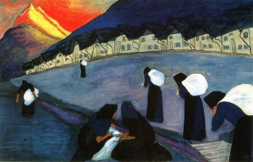 C'est enfin 1907 qu'elle reprend la peinture : elle a pu admirer en les peintures d'Henri Matisse et des Nabis, l'utilisation vibrante et émotionnellement expressive de la couleur dont elle se sent si proche. Son "Autoportrait" de 1910, alors qu'elle est encore à Munich en compagnie de Kandinsky et de Grabriele Münter, montre ce qu'elle doit aux Nabis, pour la couleur, mais avec une véhémence typiquement expressionniste, et à Munch, pour le regard. C'est à Murnau am Staffelsee que Werefkin et Jawlensky, Gabriele Münter et Wassily Kandinsky s'installent pour peindre collectivement. En 1911, Werefkin et Jawlensky passent l'été sur la côte baltique tandis que Kandinsky publie son fameux ouvrage "Du spirituel dans l'art". Puis c'est le temps des scissions, Kandinsky, Marc et Macke fondent Der Blaue Reiter, Werefkin les rejoindra en 1913. Au début de la Première Guerre mondiale, Werefkin, en compagnie toujours de Jawlensky, émigre en Suisse : le couple se sépare en 1920 et Werefkin s'installe à Ascona pour y mourir en 1938, nombre de ses oeuvres sont exposées au Museo Comunale d'Arte Moderna, sur la rive nord du lac Majeur ....