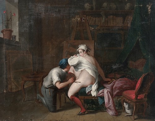 Pierre-Antoine Baudouin (1723 - 1769), élève de François Boucher et l'un des maîtres de Fragonard, connu pour ses "quatre heures du jour", une série de 4 gouaches de 1753, "Le Matin", "Le Midi, une femme endormie, un livre à côté de sa main", "Le Soir, femme nue s'habillant devant un miroir", "La Nuit" (The Metropolitan Museum of Art, New York) - "Loth et ses filles endormies", gouache de 1761 - "Le Coucher de la mariée", 1767, gouache, Ottawa, musée des beaux-arts du Canada - "Le Modèle honnête", 1769, gouache, Washington, National Gallery of Art - "L’Épouse indiscrète", vers 1767-1769, gouache, 30 × 27 cm, Paris, musée des Arts décoratifs, nombre de gravures libertines s'en inspirèrent...