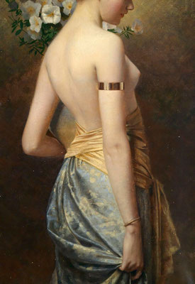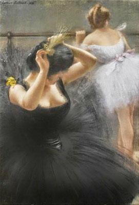 Pierre Carrier-Belleuse (1851-1932), élève d'Alexandre Cabanel à l’École des beaux-arts de Paris, expose pour la première fois au Salon de 1875, participe à l'Exposition universelle de 1889 et réalise de nombreux portraits de danseuses de l’Opéra qui feront son succès... (Before the Ballet, 1896, The Ballerina, 1897, et Nu sous un parasol...)