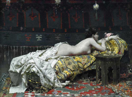 Ernest Edouard Martens (1865-1926), natif de Paris, "La Lecture ou La dernière page du roman" (1903) - Eduard Büchler (1861-1958), "Liegender weiblicher Halbakt mit Becher in der rechten Hand" (1898) ....